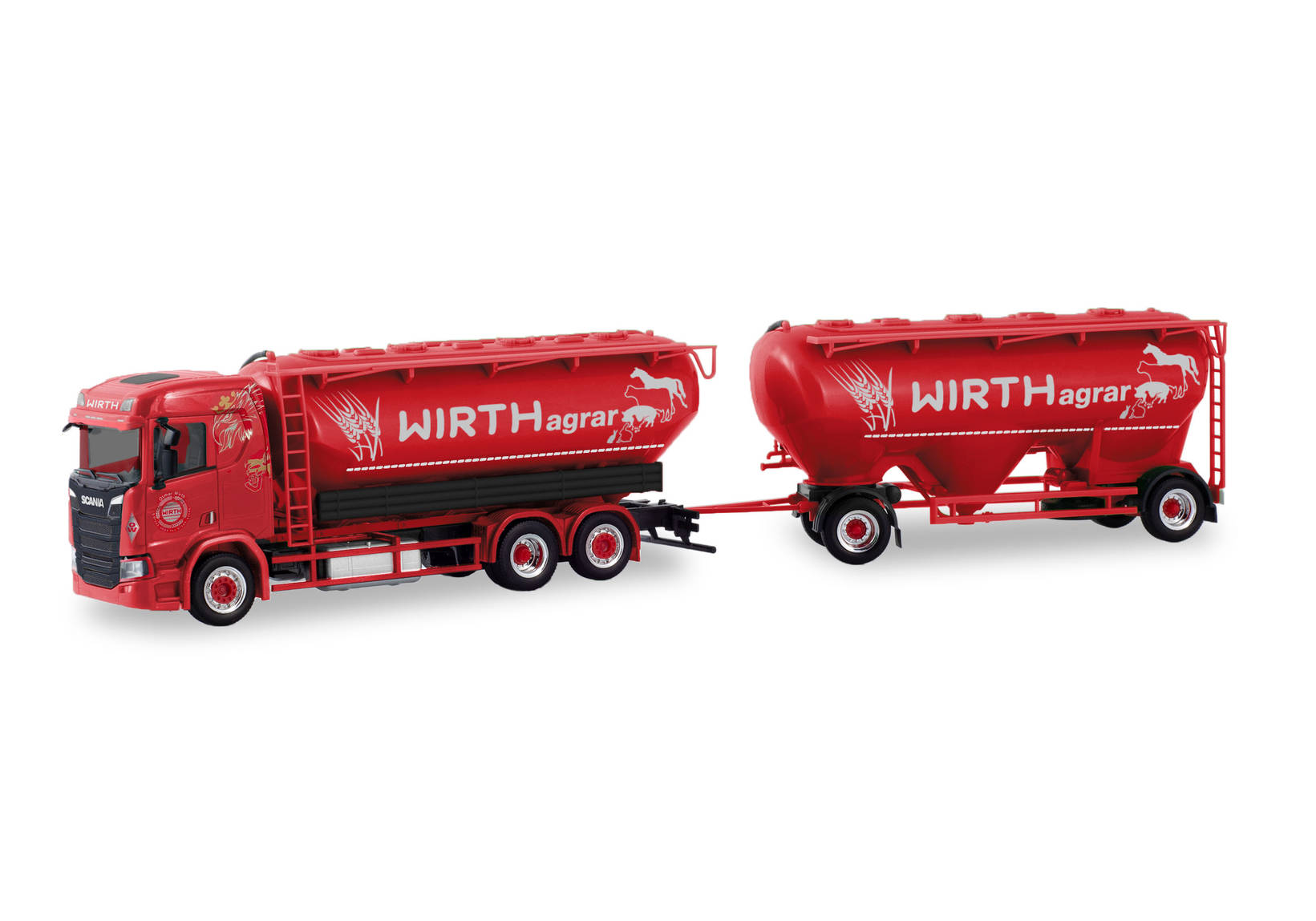 In Illertissen nahe Ulm ist der Agrarhandel, Gartenmarkt und Agrarlogistik Wirth ansässig. Neben Schubboden-Sattelzügen wird auch dieser neue Scania als Eutersilo-Hängerzug im Familienunternehmen eingesetzt, den Herpa in einmaliger Auflage fertigen wird.